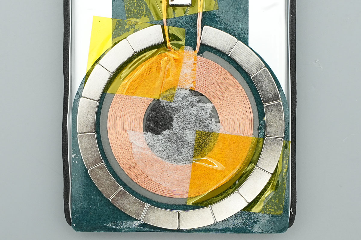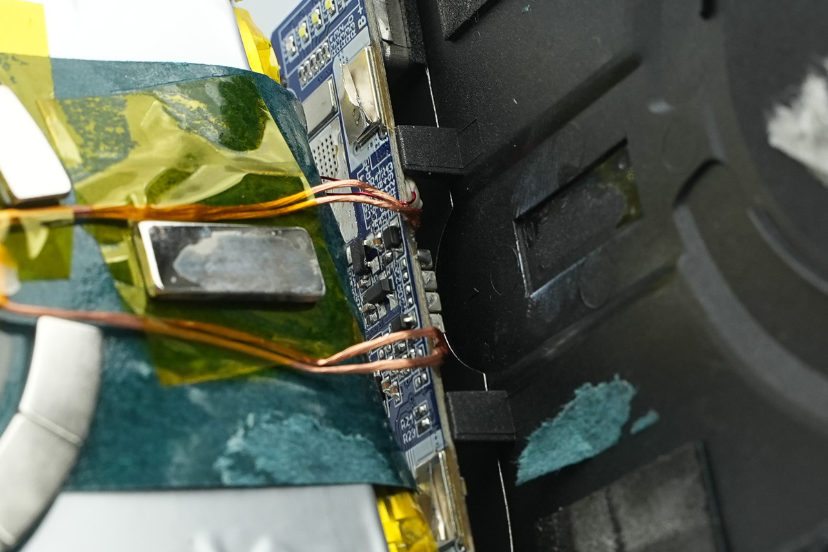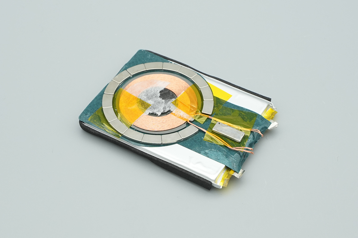 无线充电线圈固定在电芯表面中央位置,外围环绕分段式对位磁铁,形成完整的磁吸定位结构。线圈引线通过焊接方式引出,并使用胶带加固绝缘,中心区域还覆盖有缓冲材料和胶贴,用于保护线圈并增强内部结构稳定性。