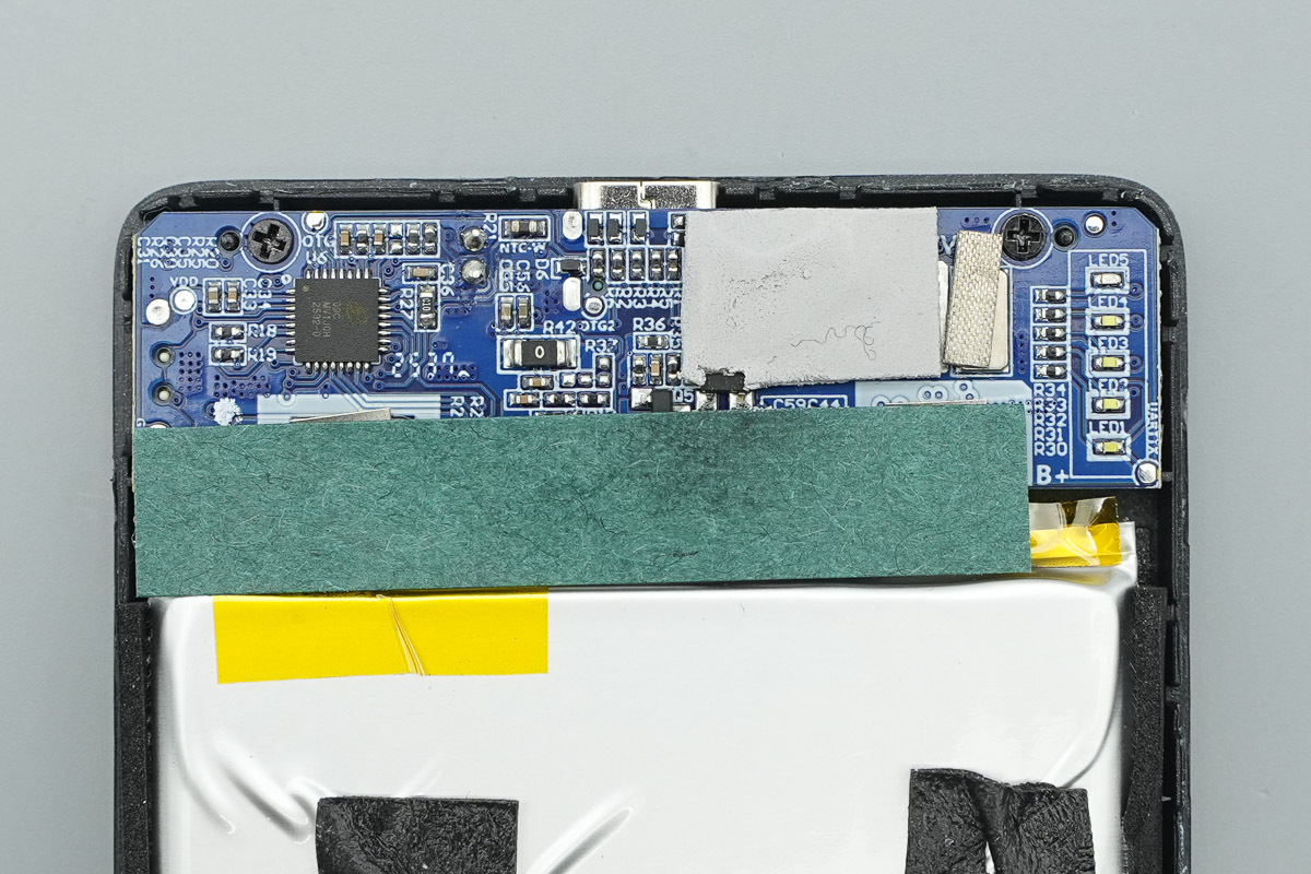 外壳内侧顶部设有一排开孔结构,对应机身上的电量显示区域,便于内部指示灯透光显示。旁边贴有一块导热贴,用于将主控芯片、电感的热量导出。