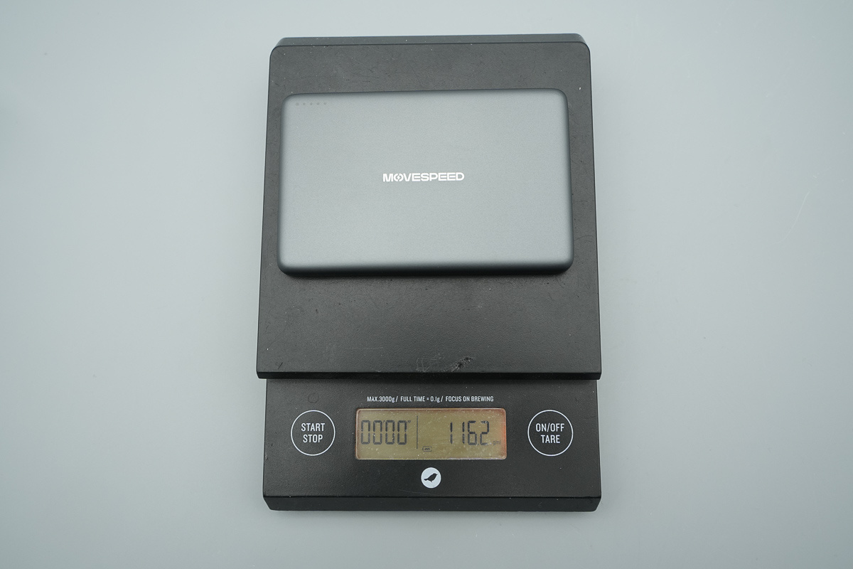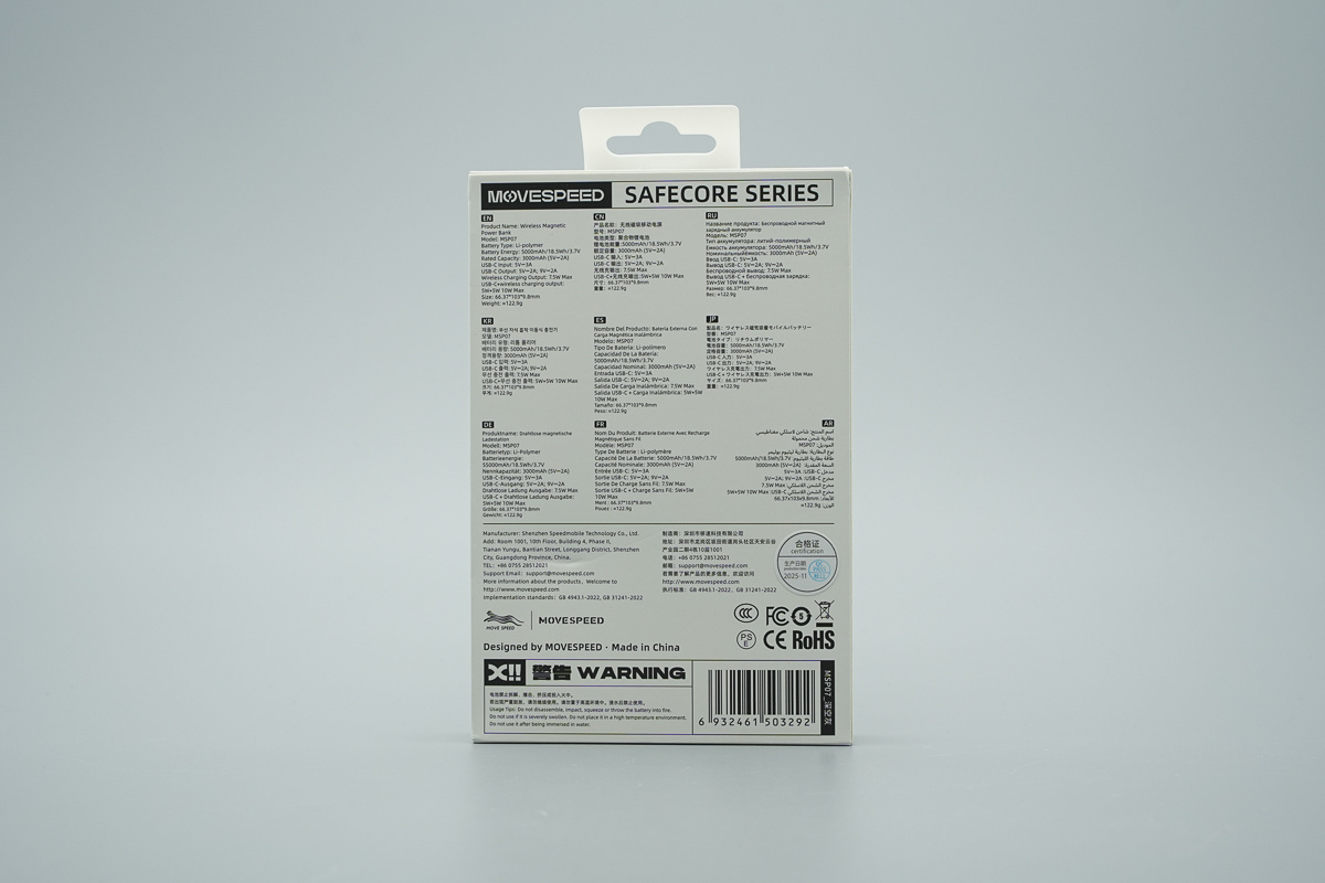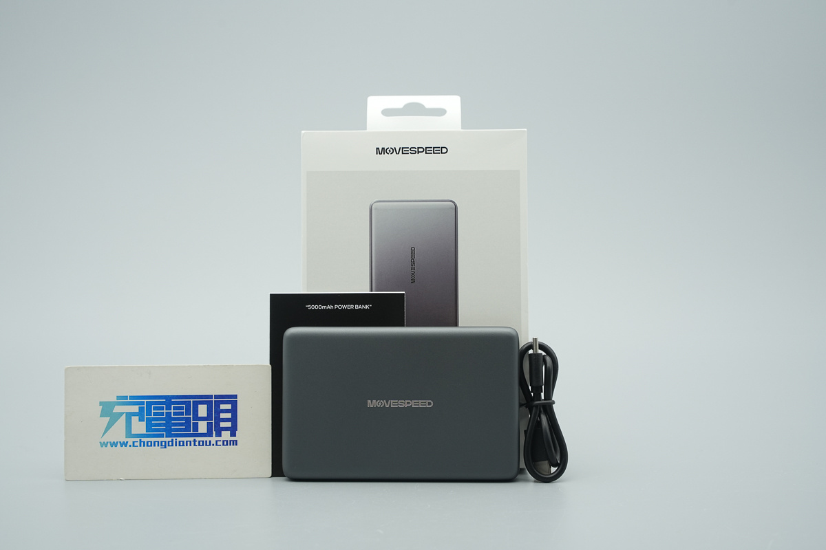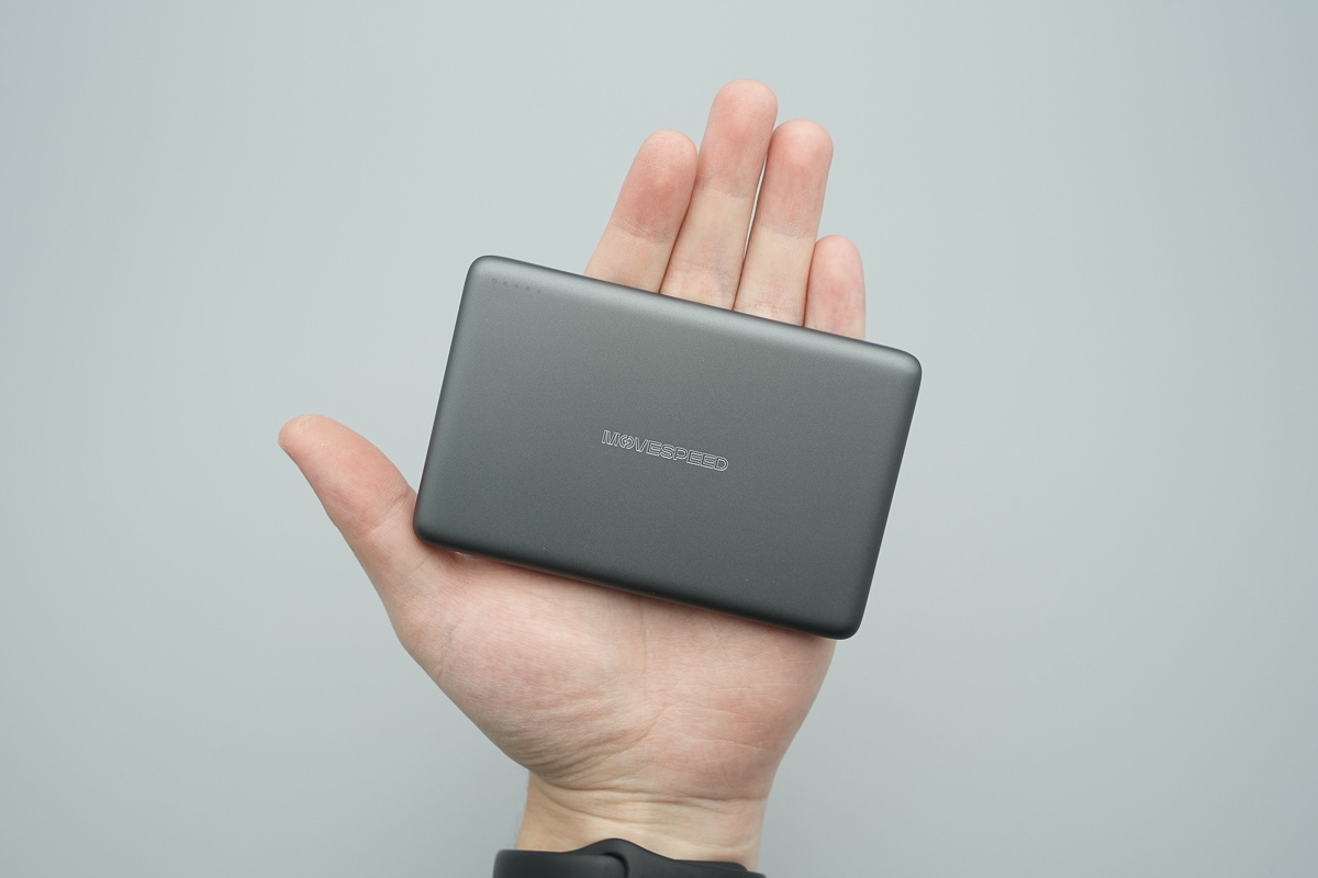 接着来看产品本体,移速半固态电池磁吸移动电源采用扁平卡片式设计,整体为深灰色配色,外壳表面做了细磨砂处理,四角及边缘均做了大圆角过渡,正中心印有 MOVESPEED 品牌标识。