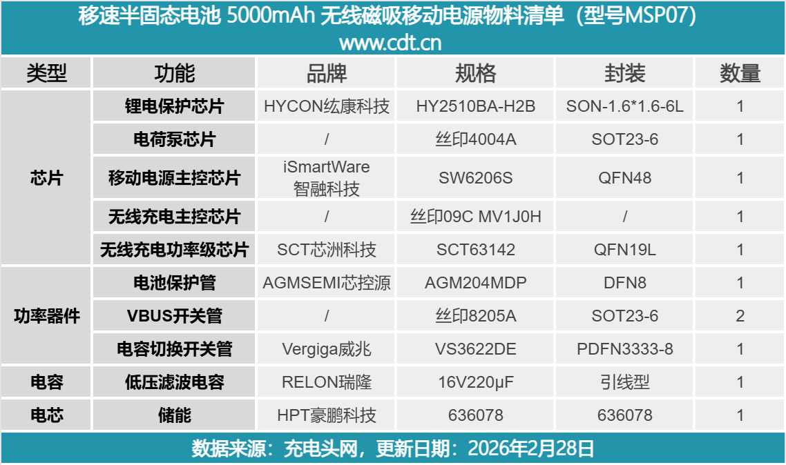 核心器件方面,这款产品采用豪鹏科技 5000mAh 半固态电芯,电芯本体通过 3C 认证,并配备纮康科技锂电保护芯片和AGMSEMI 锂电保护管进行保护管理;主控部分选用智融 SW6206S 作为移动电源 SoC,负责整机双向快充管理;无线充电部分则采用芯洲科技 SCT63142 作为无线功率发射 PMIC,搭配无线充电主控及外围功率器件实现无线输出。