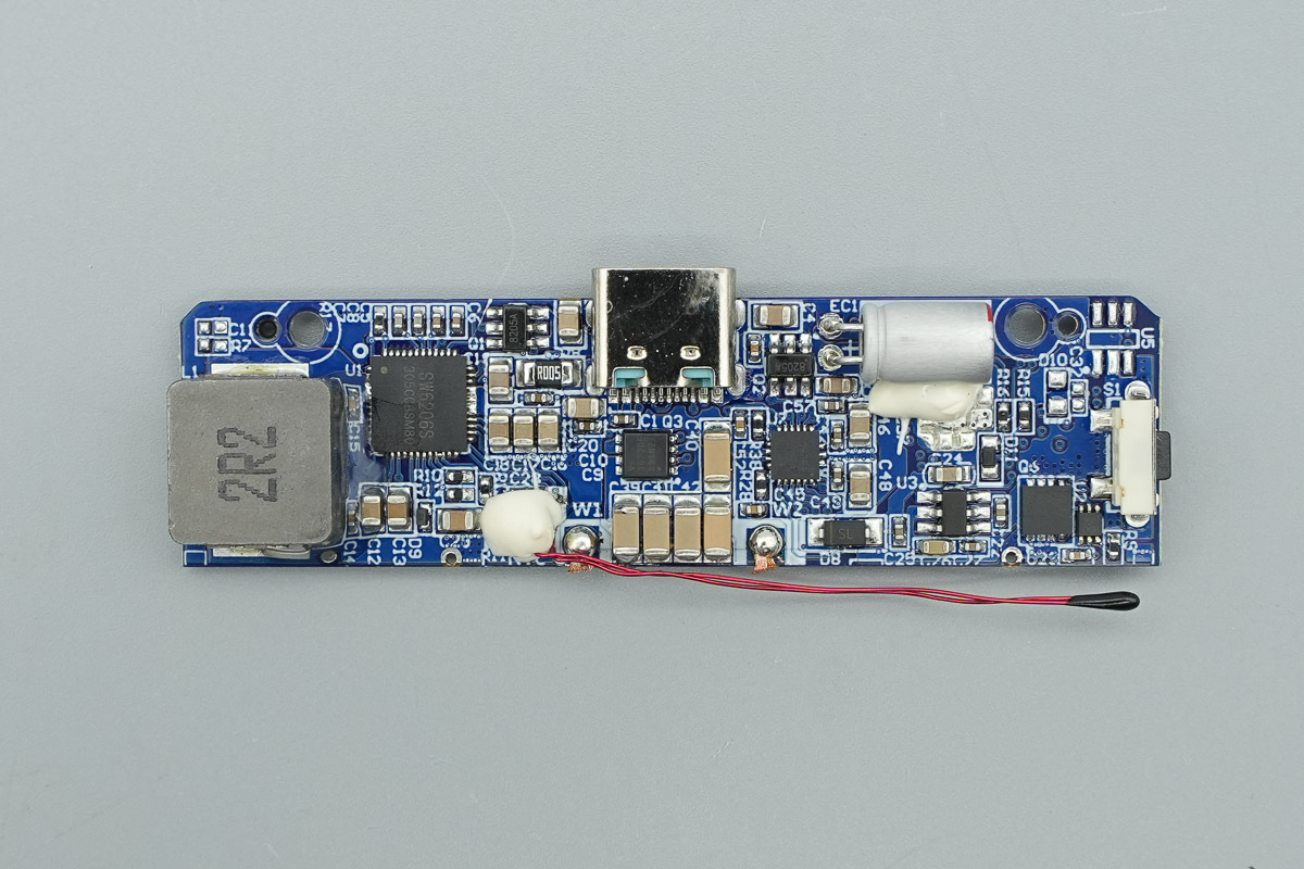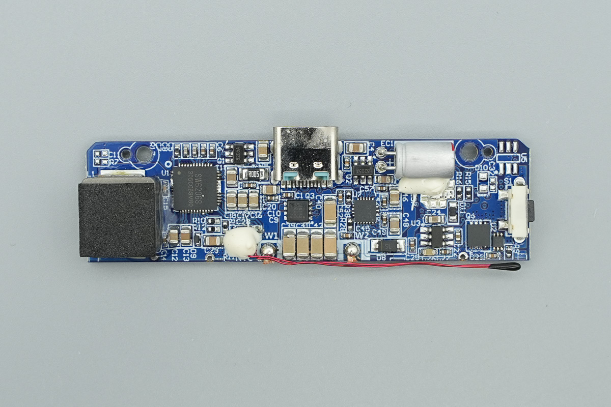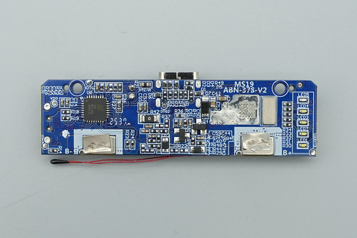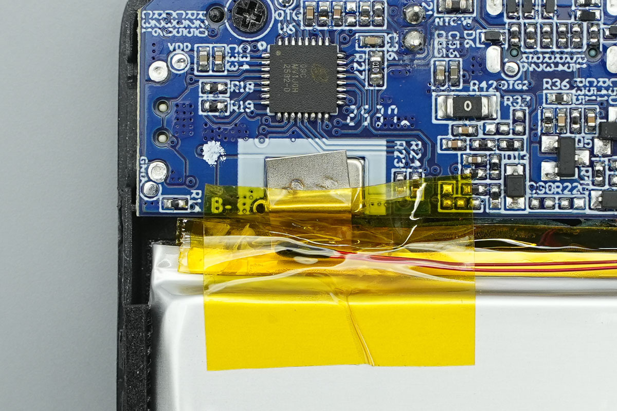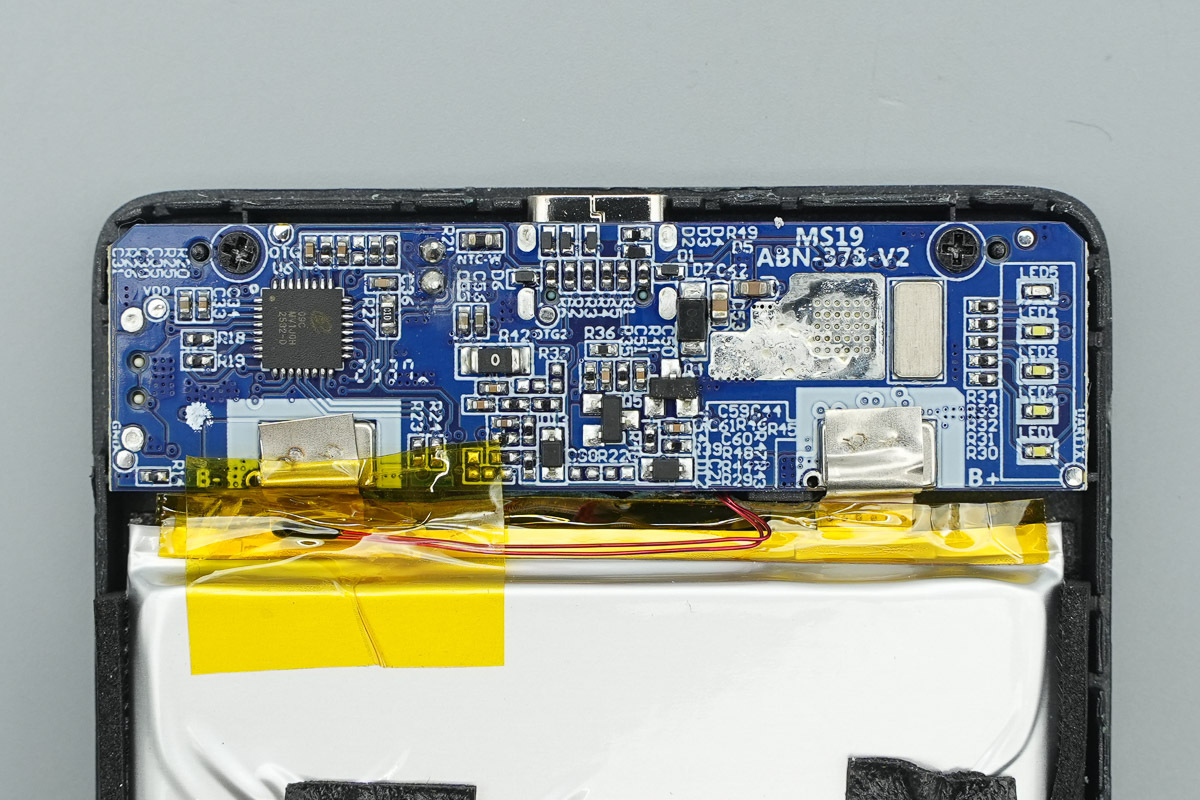 在去掉缓震泡棉后,PCB主板正面设有移动电源主控芯片、VBUS开关管、无线充电功率级芯片、锂电保护芯片、电荷泵芯片以及锂电保护管