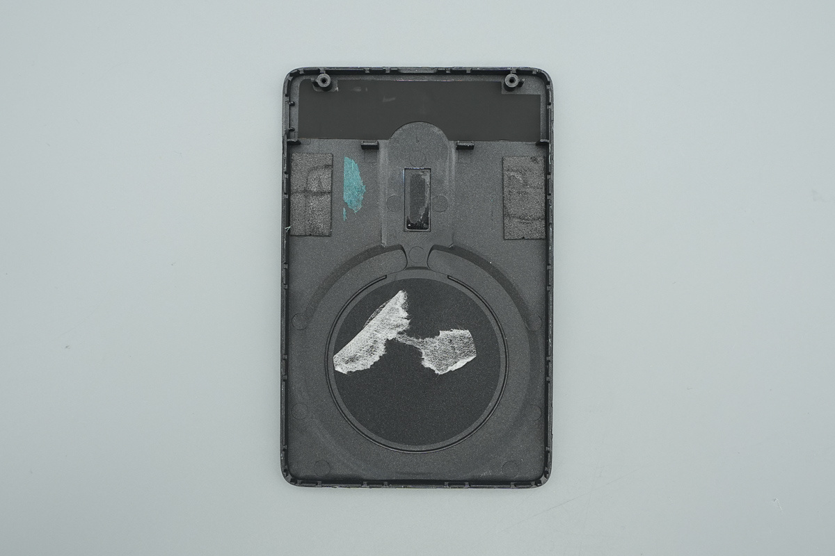 底壳内侧可见大面积凹槽结构,用于容纳无线充电线圈和磁吸组件,同时还设计有对应的走线槽与定位柱,方便内部器件安装固定。壳体内侧贴有泡棉和胶贴,一方面用于缓冲保护,另一方面也能对内部模组起到辅助定位作用。