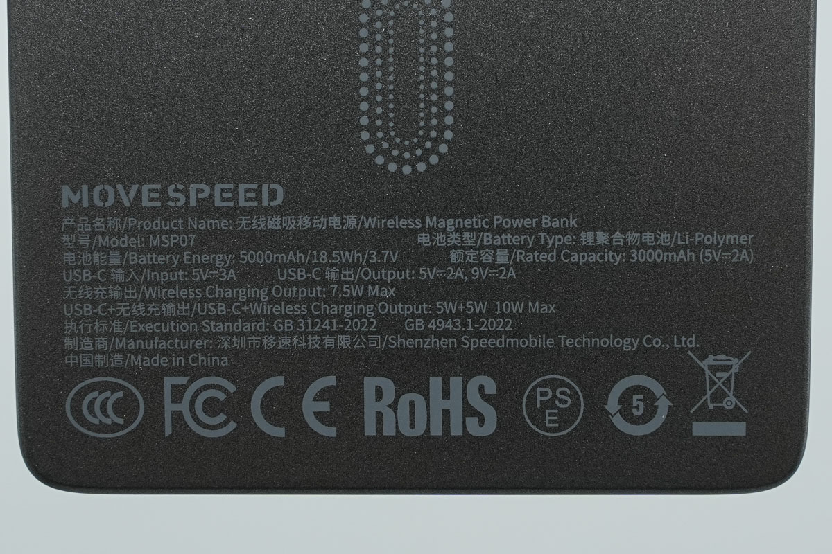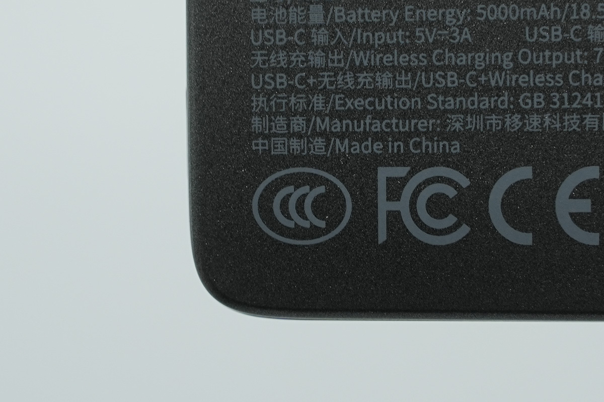 将产品拿在手中可以看出,这款移动电源整体尺寸较为小巧,单手即可轻松握持,方便携带,下方丝印区域清晰标注了产品型号、容量、输入输出参数以及认证信息。