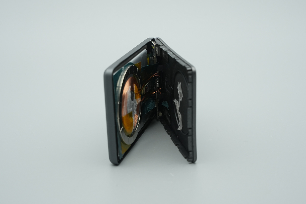 沿机身壳体缝隙拆开外壳,机身采用卡扣配合胶粘固定。打开后可以看到,内部为典型的单电芯+无线充电线圈+小板方案。