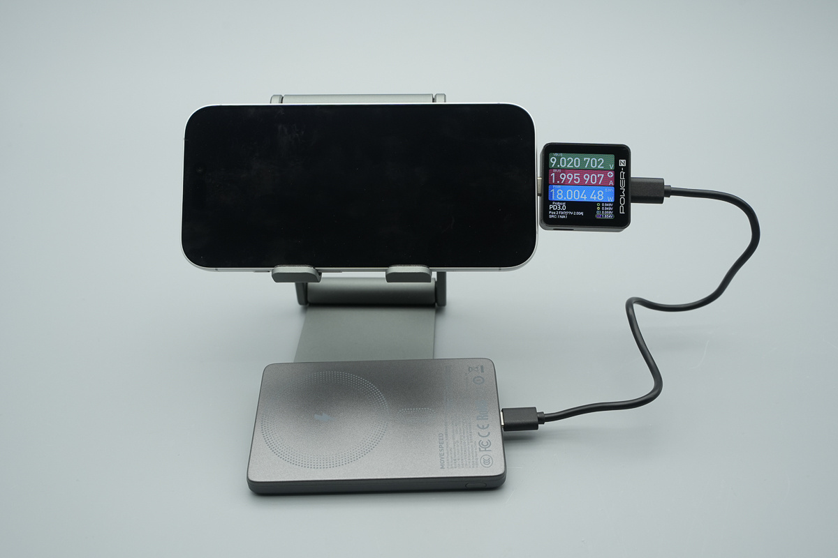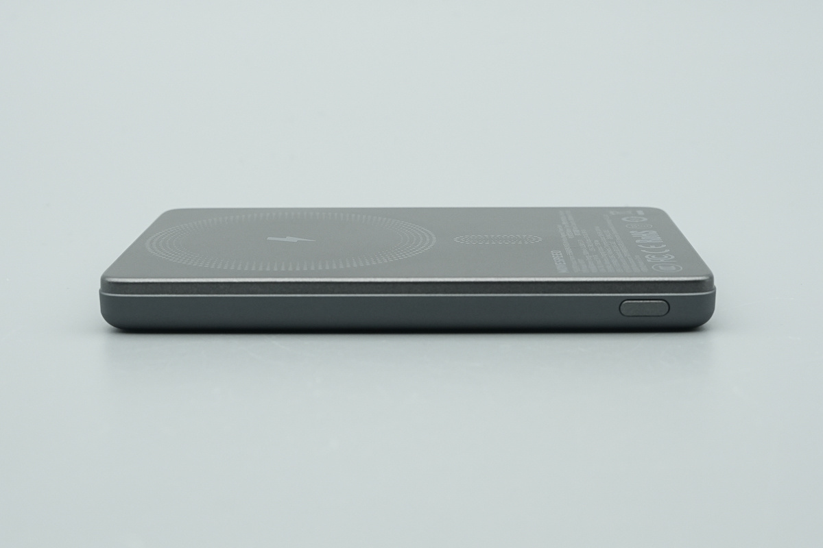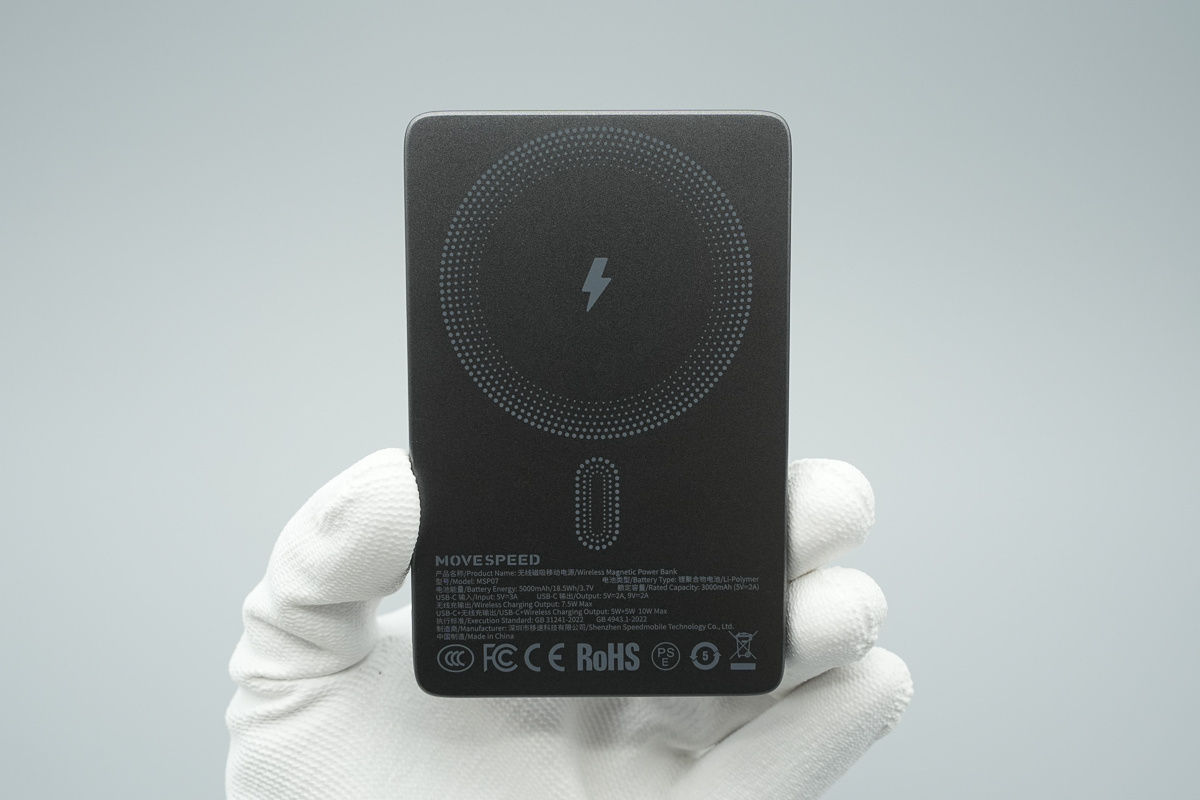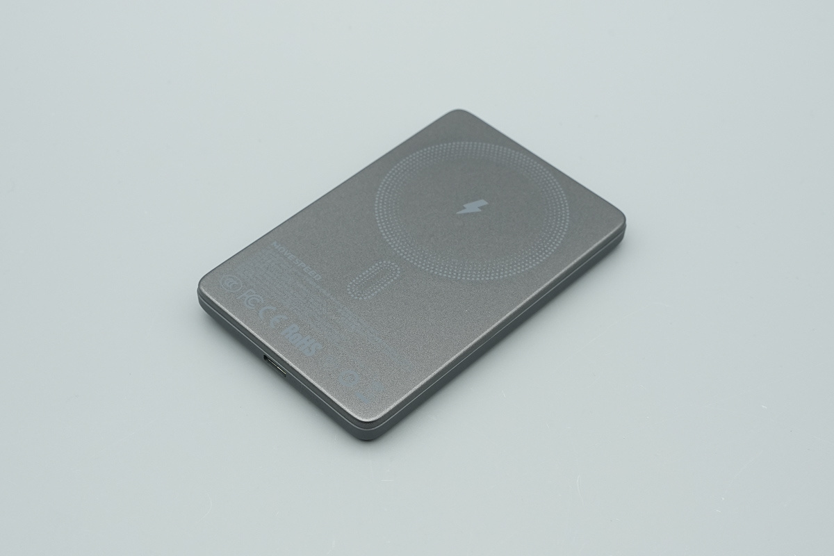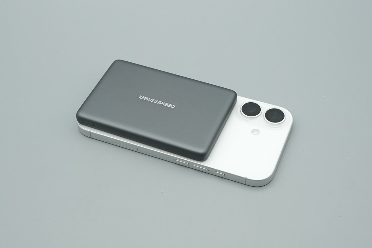 移速这款半固态电池磁吸移动电源在外观设计上采用扁平卡片式机身,厚度控制在10mm以内,非常适合随身携带,而且 5000mAh 容量足以应对日常需求。同时该产品支持USB-C 有线和磁吸无线两种充电方式,其中 USB-C 端口实测可为 iPhone 17 跑出 18W 充电功率,无线充电区域与机身尺寸适配也较为合理,吸附后能够避开摄像头模组,整体使用体验不错。