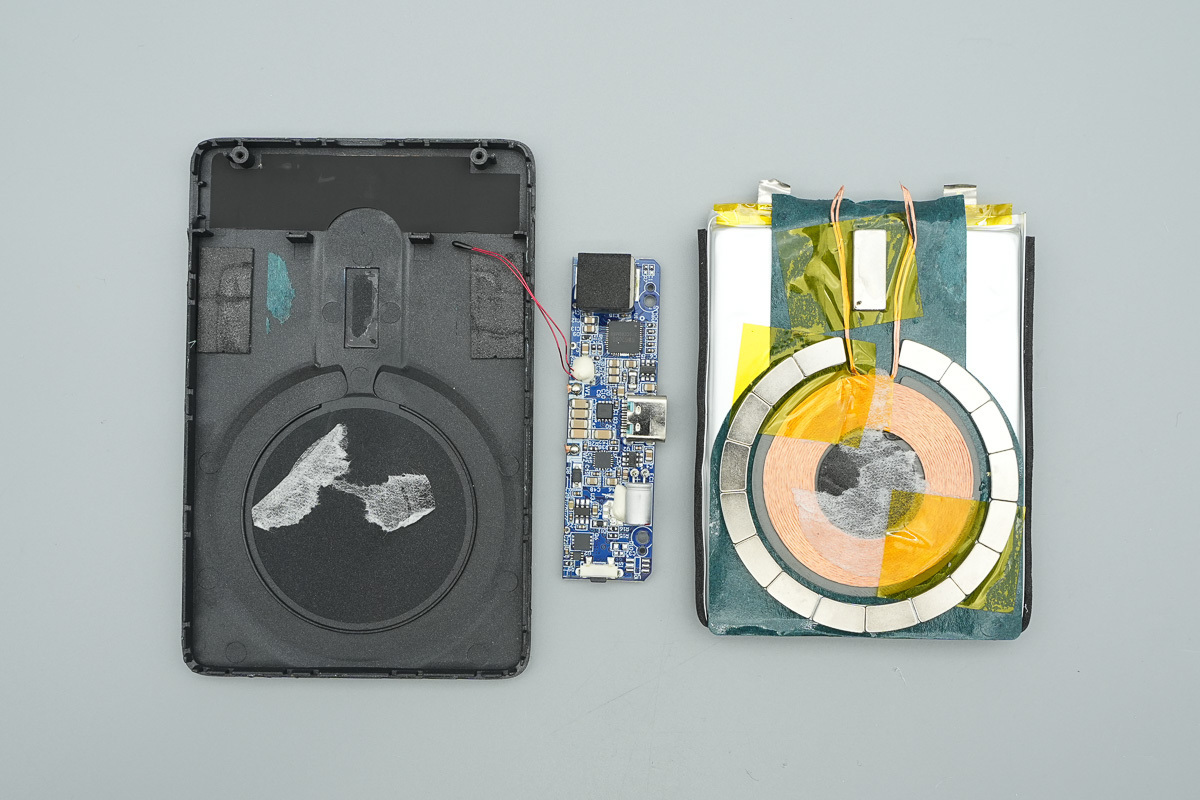 同时,机内还布置有 NTC 热敏电阻实时检测电芯温度,磁吸区域的分段式磁铁和条形对位磁铁均经过绝缘和固定处理,外壳对应位置也设计了开槽限位,结构设计比较扎实。