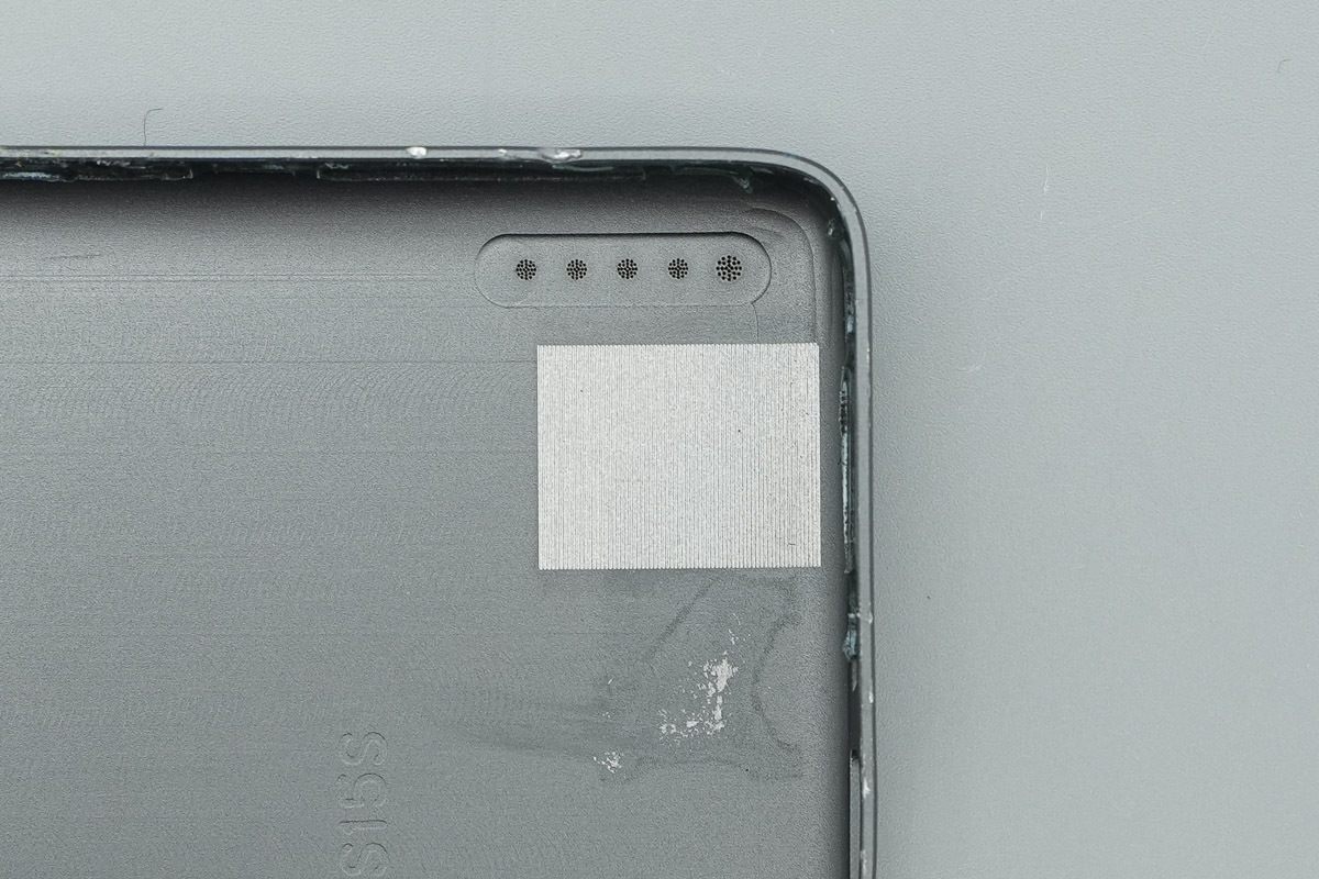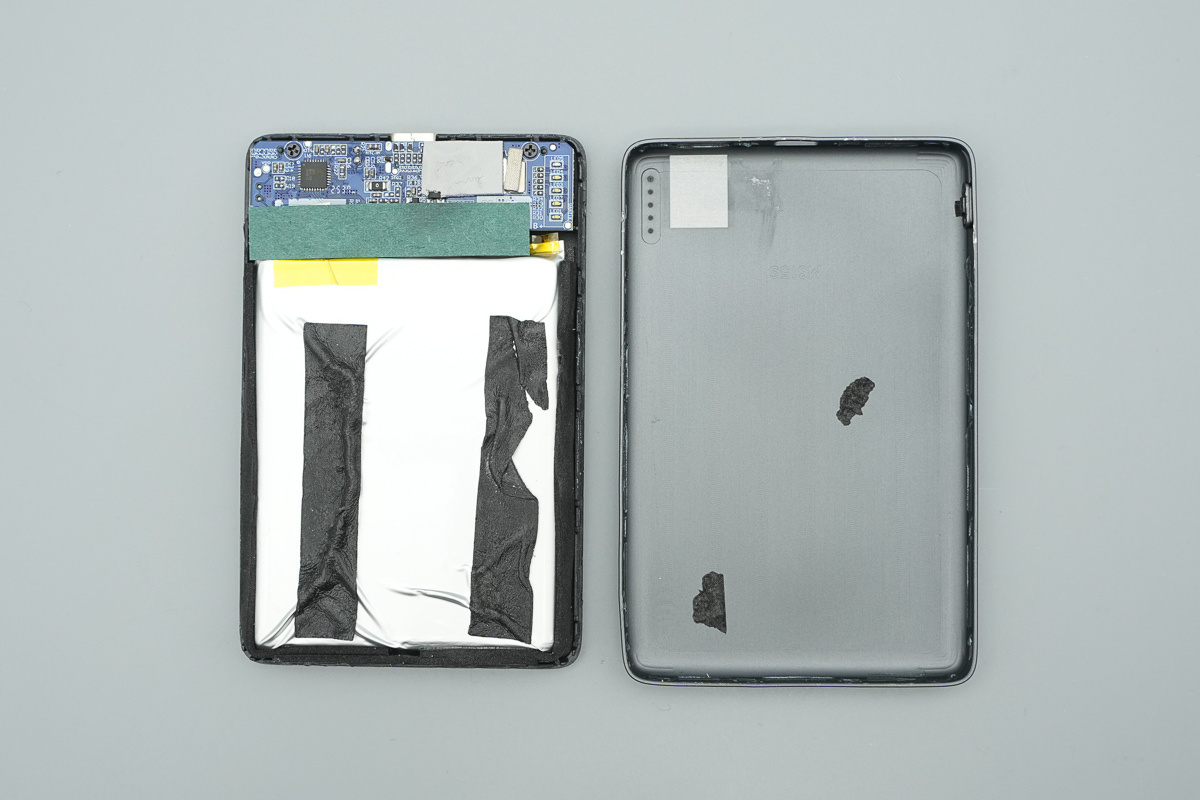 近距离观察主板,主板跟电池连接处用青稞纸覆盖绝缘,上侧贴有导热贴用于将热量散发到外壳上。