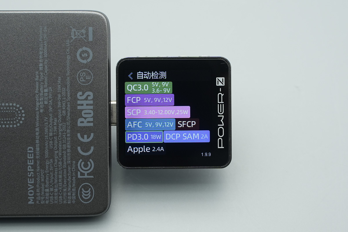 使用 POWER-Z KM003C 测试仪测试USB-C端口协议,实测支持PD3.0、QC3.0、FCP、SCP、AFC、SFCP、Apple 2.4A 以及DCP充电协议。